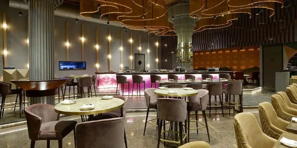 This beautifully designed restaurant features modern interiors with comfortable seating and soft ambient lighting. The elegant décor and spacious layout create a relaxing environment, making it the perfect place to enjoy fine dining, celebrations, and memorable moments with loved ones.